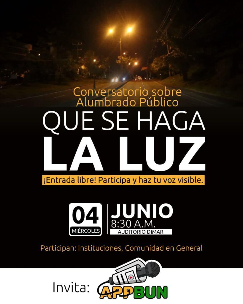 Este miércoles 4 de junio, la Asociación de Periodistas, Camarógrafos y Productores de Buenaventura, APPBUN, te invita al conversatorio “¡Que se haga la luz! Realidades y retos del alumbrado público en Buenaventura”.